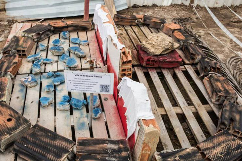 Es él quien firma la escultura Vila de Todos os Santos, un homenaje a Heloísa Helena Berto, también llamada Mãe Luizinha de Nanã, y al terreiro de candomblé que ella sostenía en la comunidad de la Vila Autódromo. La Casa de Nanã pasó meses aislada por tapias dentro del Parque Olímpico, sin luz ni agua, hasta que la municipalidad decretó el desalojo y la demolición, en febrero de 2016. “El título de la obra fue un intento por mostrar que la Vila era un espacio de todos, independiente de la religión, la etnia y la raza. Para la escultura pensé en crear un espacio circular hecho con ladrillos que encontré cerca del terreno donde estaba la casa de Doña Helena”, relata el hoy arquitecto Nunes Netto, también seguidor de las religiones de matriz africana. “Ese espacio circular tenía la función de representar la resistencia de Doña Helena, al mismo tiempo que la rueda simbolizaba las reuniones de candomble que tenían lugar en la Casa de Nanã”, agrega.