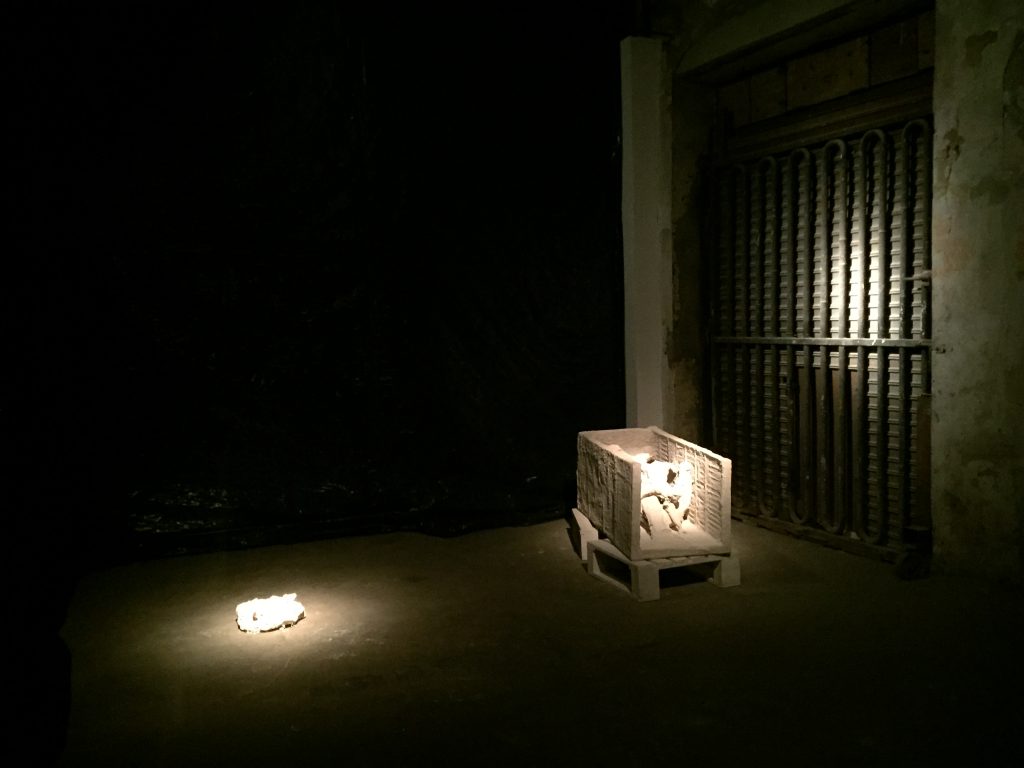 El ingreso privilegiado a la instalación presenta a nivel del piso dos esculturas de animales mitológicos dispuestas a modo de espejo, enmarcando la entrada. Por detrás se encuentra un espacio compartimentado a partir del posicionamiento de 4 a 6 objetos-columnas, cuyo color piedra es de igual génesis que el del resto de los objetos. Hacia el fondo de la nave central un tercer animal mitológico se posiciona direccionado hacia la pared ocupando el eje central de la vista principal.