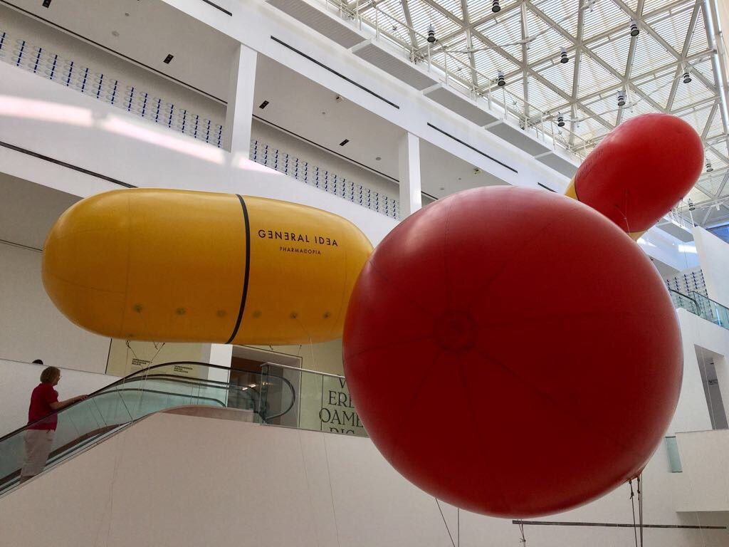 Ahora es un hombre afligido, de barba larga y cuidadadamente recortada, que en la presentación realizada en el Auditorio del Museo ese día de finales de marzo se conmovió y su voz se rajó cuando recordó a sus dos amigos muertos por la pornografía fallida de las pastillas blancas y azules y luego también rojo-amarillo que cuelgan del techo de MALBA como teledirigibles. Ningún chiste. En esa conversación y en ese quiebre de voz estuvo el momento más emocionante del primer recorrido por Tiempo Partido. Quizá por su simulacro de performance instatánea, quizá porque en esa voz que se tragaba discretamente unas lágrimas se percibía también la honestidad de su dolor. Ahí y sólo ahí emergió la chispa de todo lo creado y ahora clasificado casi arquelógicamente más allá de su pasmosa y grandilocuente belleza.