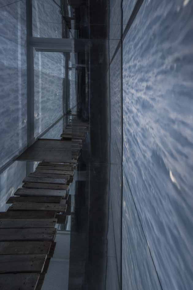 “Crossings” está compuesto de imágenes de carreteras desoladas y oscuras, de inmensas dunas, de frondosos árboles que tocan el cielo, del infinito y amenazante mar. Son paisajes proyectados en una pantalla fragmentada en tres partes, en un intento acertado de representar un recorrido colmado de dificultades. Los sonidos del silencio, de los motores, de los pasos, de los niños llorando ante la oscuridad y el desamparo, son intercalados con los cuerpos y miradas de aquellos que vivieron la odisea y que aparecen y se funden en el negro profundo de la pantalla, o de lo desconocido y peligroso.