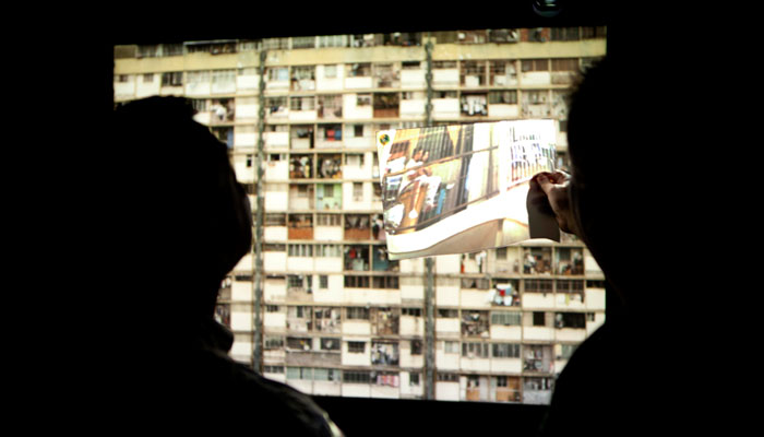El visitante entra a la sala oscura y se encuentra frente a la proyección de un gran edificio de Caracas. Son 560 apartamentos con pequeños balcones que crean un mosaico infinito.