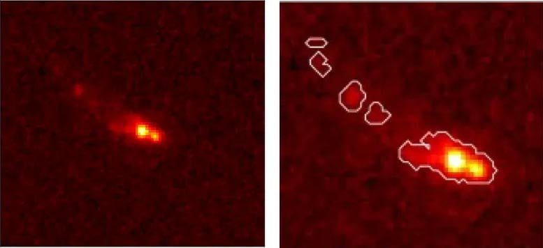 Gz9p3, la galaxia fusionada más brillante conocida en los primeros 500 millones de años del universo (observada por el Telescopio Espacial James Webb). Izquierda: las imágenes en vivo muestran un núcleo doble dentro de la región central. Derecha: Las características de la sección transversal clara revelan una estructura alargada y grumosa resultante de la fusión de galaxias. Crédito: NASA